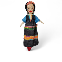 Her body was sewn from a muslin fabric. Her legs are painted with a fabric medium to reflect her prosthetic leg and tall red lace up boots. She wears a long skirt and tunic top sewn from a two tone black fabric. The skirt is embellished with an orange geometric patterned fabric strip and colorful fiber trim. Her top is embellished with fiber trim and a skull bead on her neckline, and a colorful beaded trim along the bottom hem. She wears a Blue Turquoise flower patterned shawl.